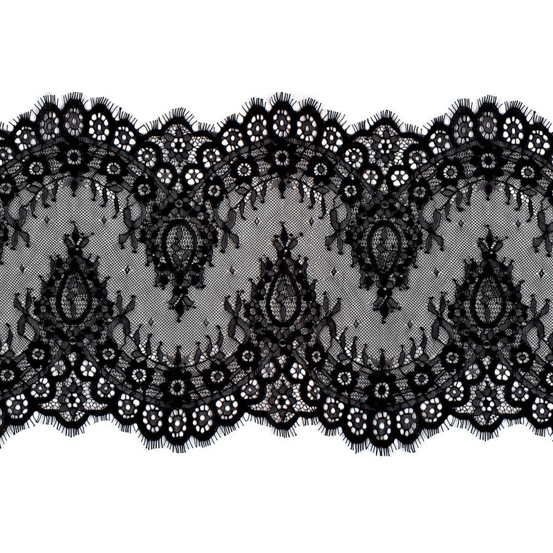 9″ wide black Chantilly lace; this is a unique galloon lace with a floral and paisley pattern, scalloped eyelash borders, and on a netting background. This beautiful lace may be cut along the center to make borders or trim.