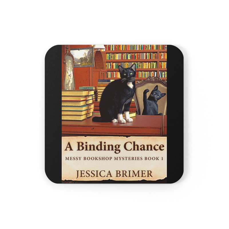 These coasters are made with a high-gloss top and feature a cork back to prevent sliding, and each order comes with a set of four coasters. The cover art in these coasters is from Jessica Brimer’s book, A Binding Chance.