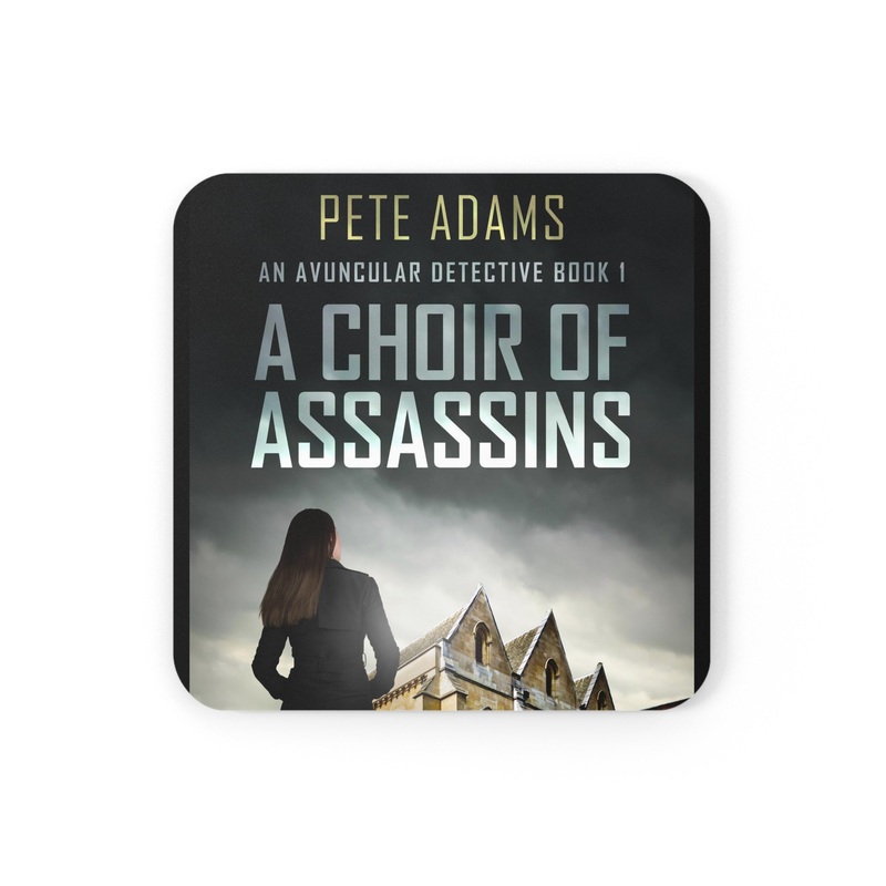 These coasters are made with a high-gloss top and feature a cork back to prevent sliding, and each order comes with a set of four coasters. The cover art in these coasters is from Pete Adams's book, A Choir Of Assassins.