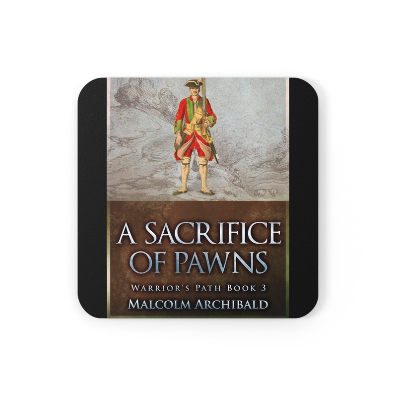 These coasters are made with a high-gloss top and feature a cork back to prevent sliding, and each order comes with a set of four coasters. The cover art in these coasters is from Malcolm Archibald’s book, A Sacrifice of Pawns.