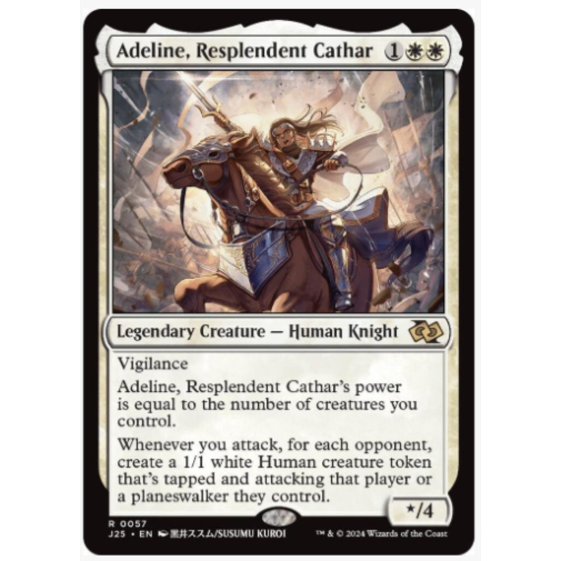 VigilanceAdeline, Resplendent Cathar's power is equal to the number of creatures you control.Whenever you attack, for each opponent, create a 1/1 white Human creature token that's tapped and attacking that player or a planeswalker they control.Rarity:R#:57