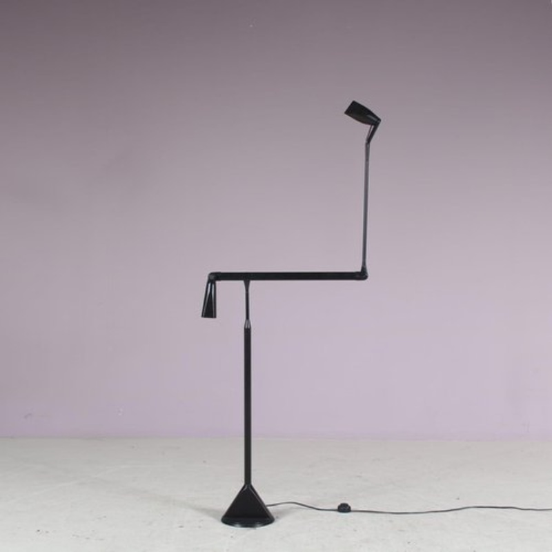 A unique, minimalist floor lamp model Lola designed by Alberto Meda & Paolo Rizzatto, manufactured by Luceplan around 1990. Made of high quality black metal with a minimalist design. This eye-catching lamp can be adjusted in different positions from three different joints, making it suitable for many different kinds of interiors and situations! It emits a bright, directional light. This all combines into a piece that can seamlessly fit in the decor, blending in when necessary and standing out when needed! It remains in very good vintage condition with minor wear consistent with age and use, preserving a beautiful patina.