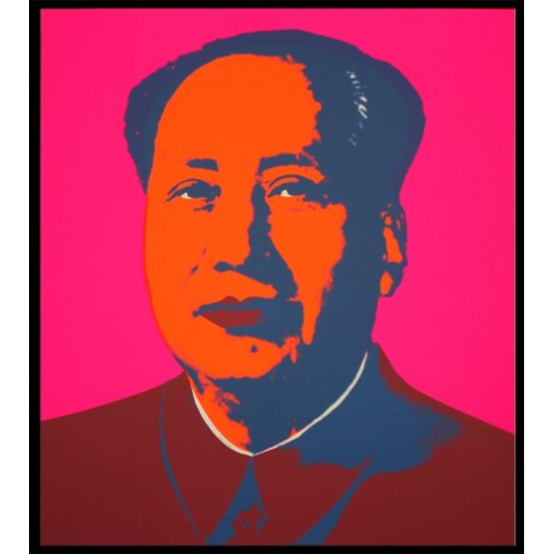 This vibrant artwork, "Mao" by Andy Warhol, is a high-quality print produced by Sunday B. Morning. Measuring 33.5 x 29.5 inches, it features Warhol's iconic portrayal of Mao Zedong in striking pink and orange hues. The print is stamped on the reverse with