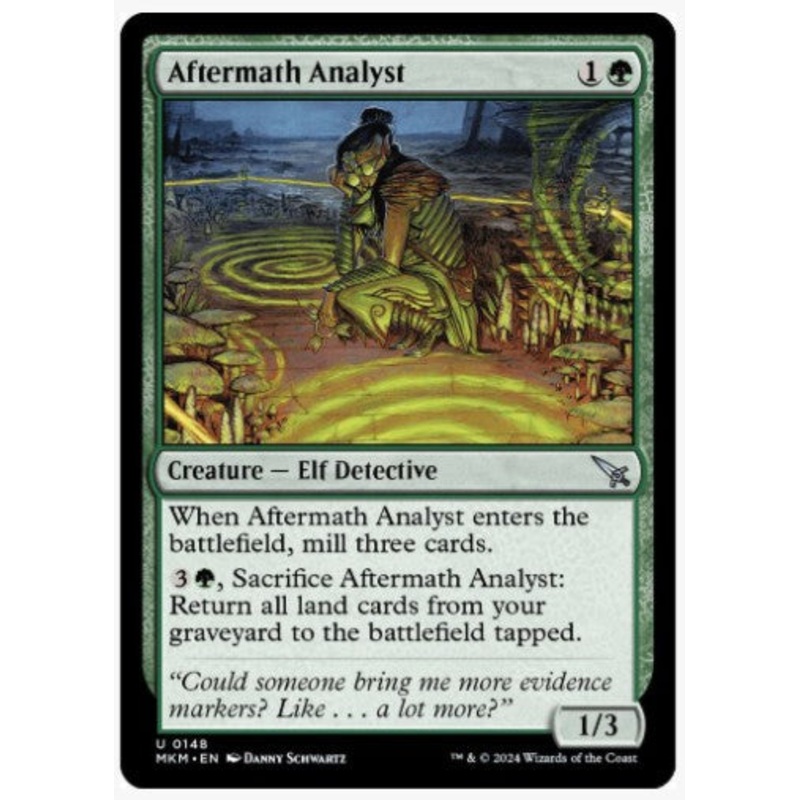 When Aftermath Analyst enters the battlefield, mill three cards.3G, Sacrifice Aftermath Analyst: Return all land cards from your graveyard to the battlefield tapped.Rarity:U#:148Card Type:Creature Elf DetectiveP / T:1 / 3Flavor:"Could someone bring me more