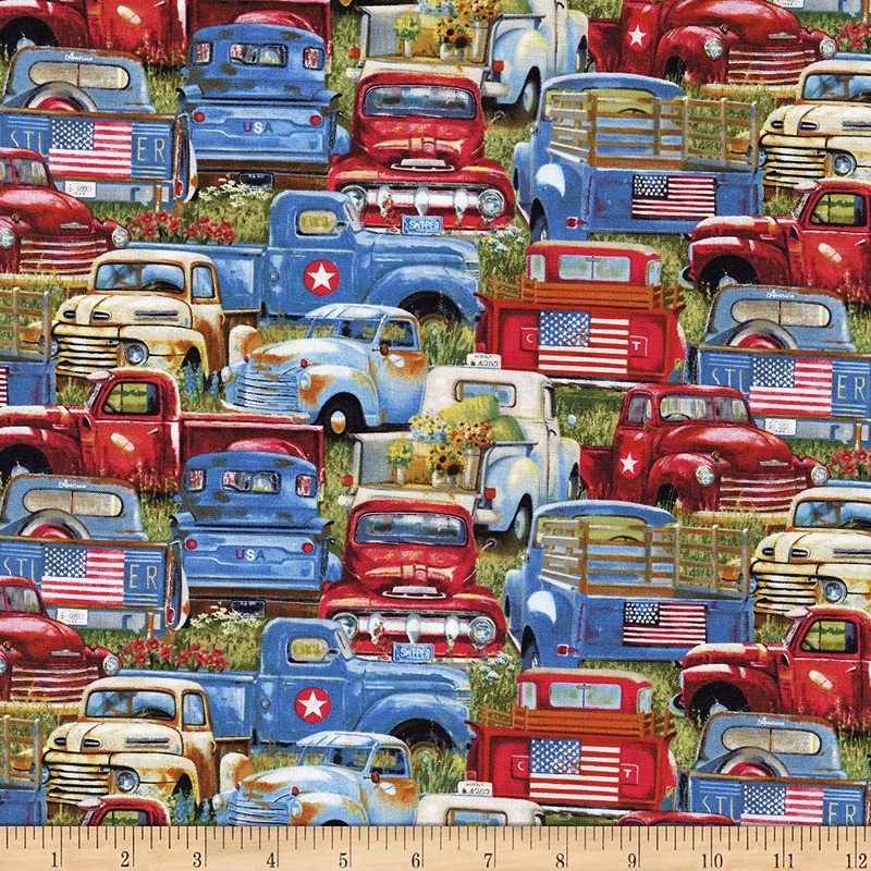 American Spirit Trucks in Multi designed by Elizabeth's Studio 44 inches wide 100% Cotton Quilting Fabric ES-21004 MultiThe American Spirit fabric collection by Elizabeth's Studio showcases patriotic and Americana-themed designs. It features detailed print