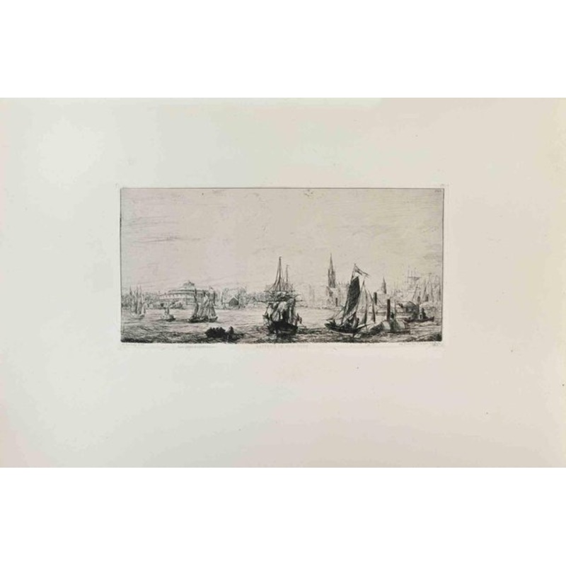 Batterie de New-York is an artwork realized by Anatole De Bonsonge in the 1870s. Etching. Good conditions. Realized for the "Socit des Aquafortistes. Born on the initiative of the publisher Alfred Cadart, the Socit des Aquafortistes had the aim of reviving