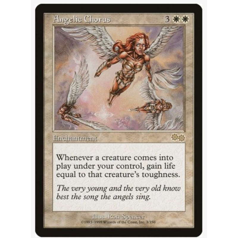 Whenever a creature comes into play under your control, gain life equal to that creature's toughness.Rarity:R#:3Card Type:EnchantmentFlavor:The very young and the very old know best the song the angels sing.Casting Cost: 3WW