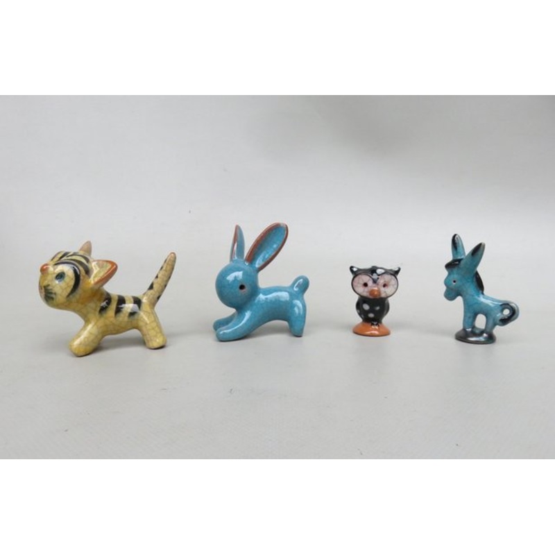 A decorative set of 4 animal sculptures: cat, rabbit, owl, donkey, designed by Walter Bosse for the Majolika in Karlsruhe in the 1950s.Cat: height 6.5 cm, width 8 cm, depth 5 cmHase: height 7.5 cm, width 7 cm, depth 3 cmOwl (gluts): height 4.5 cm, width 3.