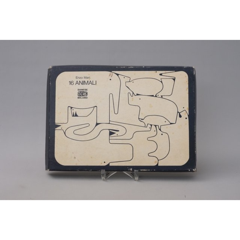 All 16 animals are in flawless and very good condition. The original box shows signs of age and storage. The 4 edges of the lid are torn. Cardboard is rubbed, browned and stained. Creator Enzo Mari Manufacturer Danese Design Period 1950 to 1959 Production