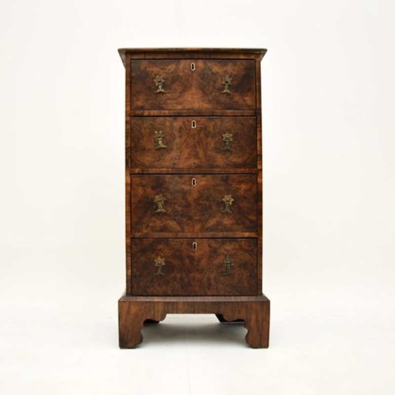 A stunning antique burr walnut slim chest of drawers, made in England and dating from around 1910.