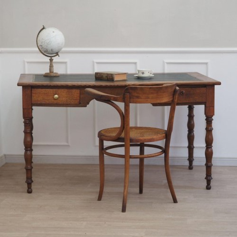 This stylish vintage desk impresses with its classic shape, the enormous worktop depth of 89cm and artfully turned legs. with two drawers, it offers practical storage space and is ideal as an elegant workstation. The well-made dark green faux leather cover is robust and has detailed gold decoration all around. Material: Solid oak wood, dark green faux leather Dimensions in cm: H 77 / W 140 / D 89 Origin: France – Perfect as an impressive desk for the office or living area Features: Turned legs and two drawers, lockable on the right Dark green faux leather cover in very good condition with decoration Plenty of storage space, 89cm depth Condition: Very good, refurbished and maintained, signs of age-related wear