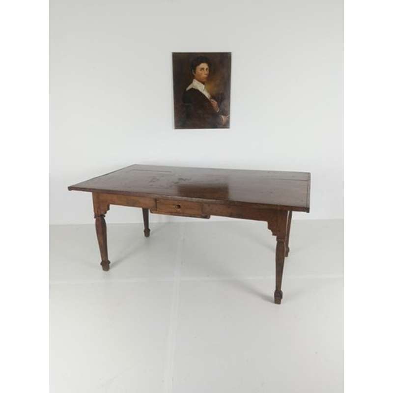 Sturdy antique table with a unique tabletop and a large central drawer. The tabletop is made from solid teak wood. It has a beautiful aged appearance with charming old repairs. The table is suitable for a maximum of 6-8 people. A table with a warm look and lots of character. Measurements Height 78cm Width 177cm Depth 100cm Seating height 63cm