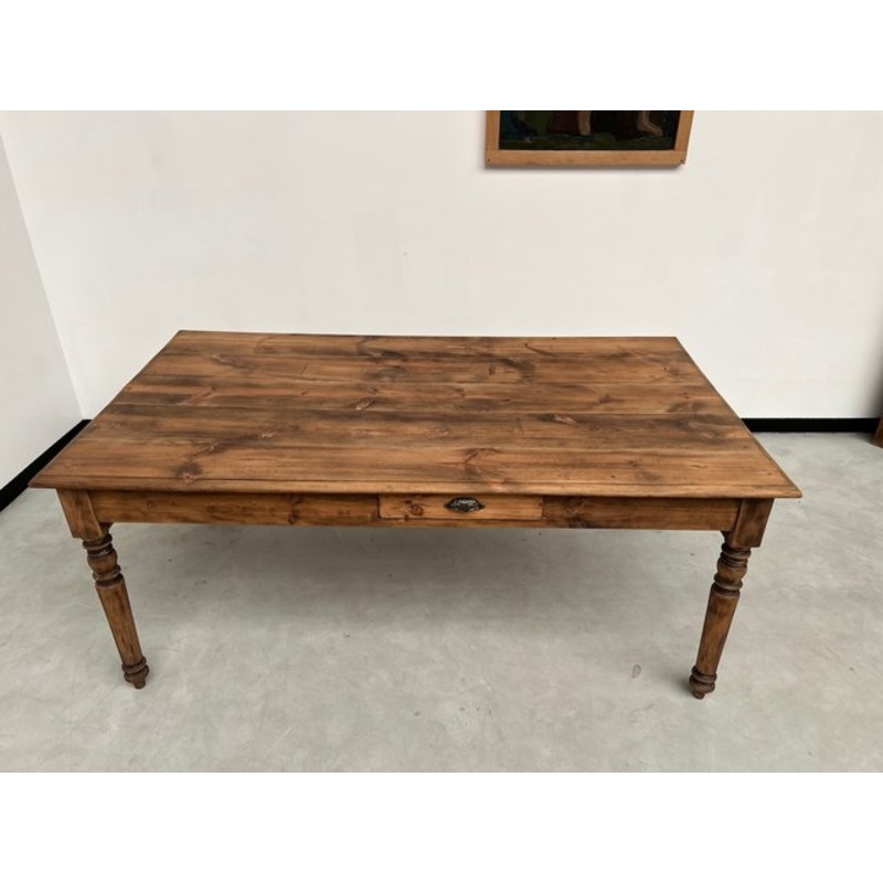Antique farm table with 3 drawers, fully restored. Its wide pine top has a lovely patina and its 3 functional drawers make it practical for everyday use. Offered in a matte varnished finish, it is a beautiful piece to bring an authentic touch to your interior.