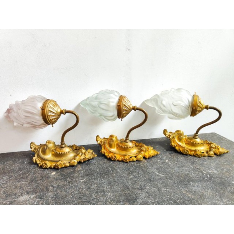 Beautiful antique French wall lights/ torch sconces. Constructed out of gilded cast brass shields with etched flame glasses. Design Period 1890 to 1919 Production Period Unknown Country of Manufacture France Style Classical, Vintage, Antique Detailed Condi