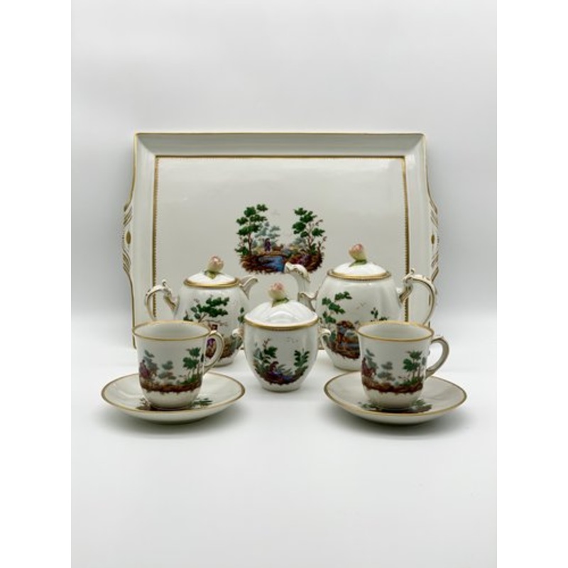 Complete set consists of 8 parts: tray, coffee pot, milk jug, sugar bowl, two cups, two saucers. Covers included.