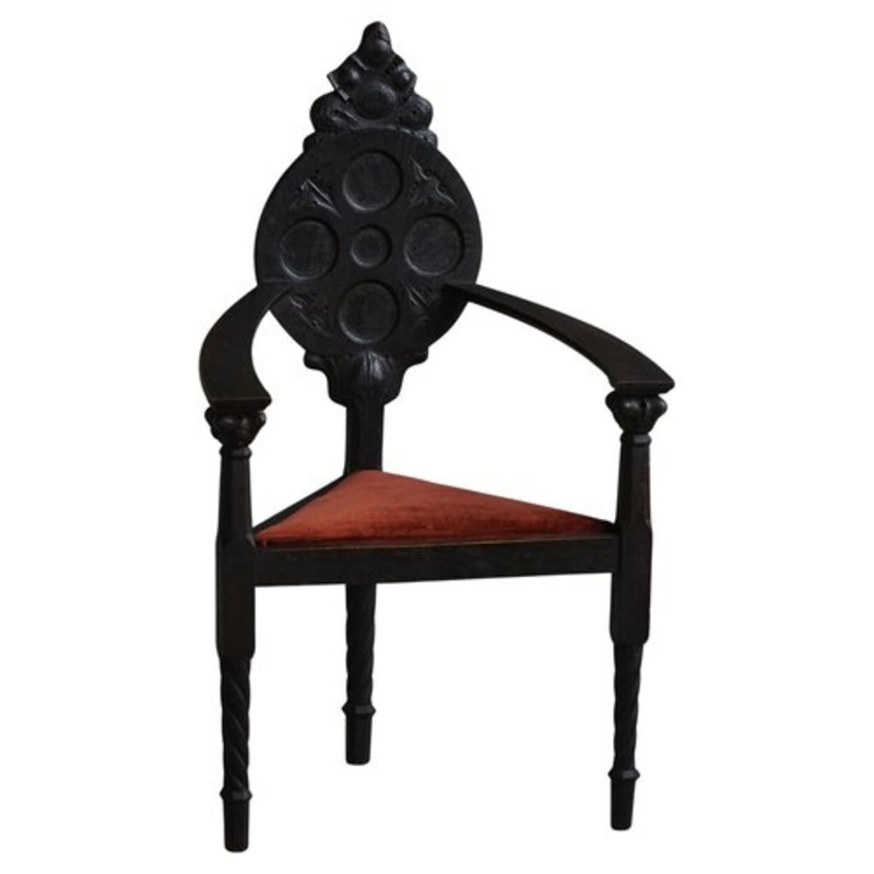 An antique primitive hand-crafted armchair, made by a Scandinavian cabinetmaker in the late 19th century. Black-painted wood with a red velvet seat, tripod turned legs, and a backrest featuring round carvings. A charming piece with rustic elegance and historical character. This beauty will complement many interior styles. A modern, antique, Scandinavian or a wabi sabi home decor