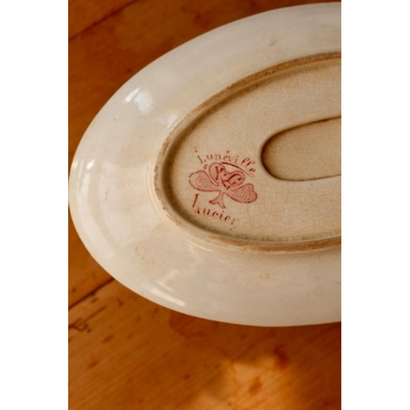 Beautiful refined antique gravy boat, in iron clay signed Lunville. It rests directly on its integrated base, offering a clean and functional silhouette. Its deep red floral decoration and its nicely curved handle make it both decorative and practical. Ideal for sauces, it fits perfectly into an old-style table or mixed with more contemporary elements.