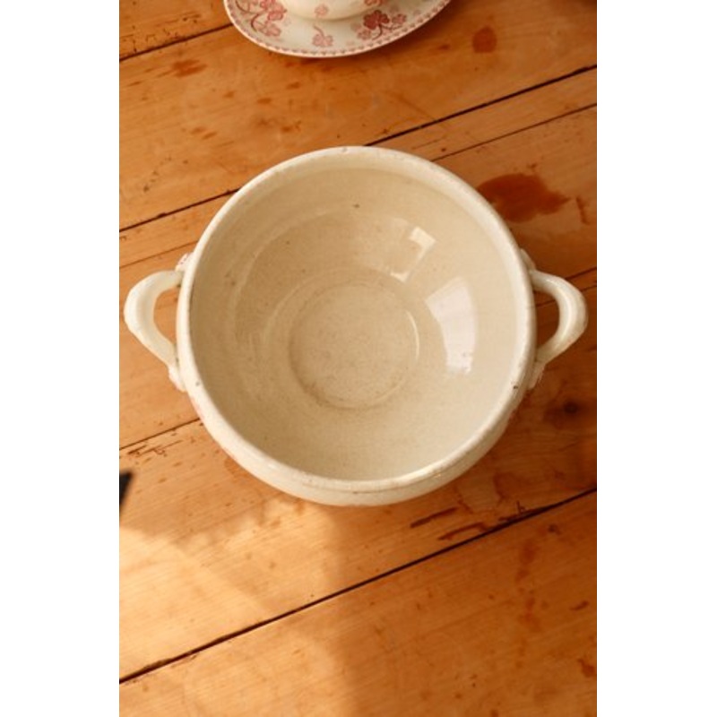 Charming iron earth tureen from the Lunville factory, Lucien model, decorated with a delicate pattern of red clovers and a fine floral frieze. Its elegant curved handles give it a refined look, perfect for a table with old-world charm. The crackle of time