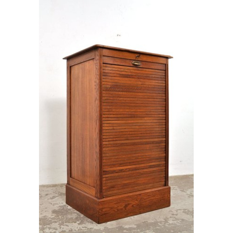 Still in excellent condition after more than 100 years. You don't often come across this larger size. Beautiful panels all around, beautiful high plinth and beautiful details. The oak cupboard has a well-functioning roller door, a working lock with key and