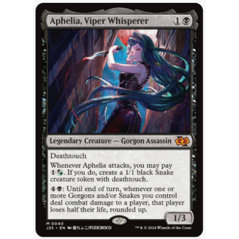 DeathtouchWhenever Aphelia attacks, you may pay 1(B/G). If you do, create a 1/1 black Snake creature token with deathtouch.4B: Until end of turn, whenever one or more Gorgons and/or Snakes you control deal combat damage to a player, that player loses half