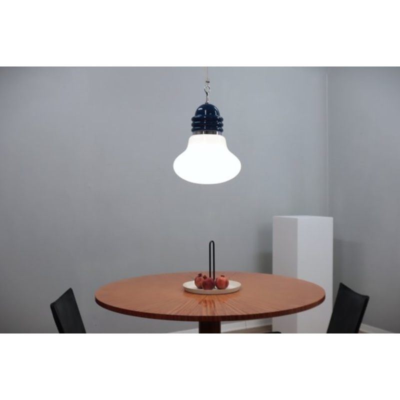 Bring home a piece of Italian design history with this charming Arianna pendant lamp, crafted by Artemide in the 1960s. Its distinctive bulb-shaped silhouette, featuring a deep glossy blue top and an opaline white glass diffuser, creates a soft, enveloping glow.