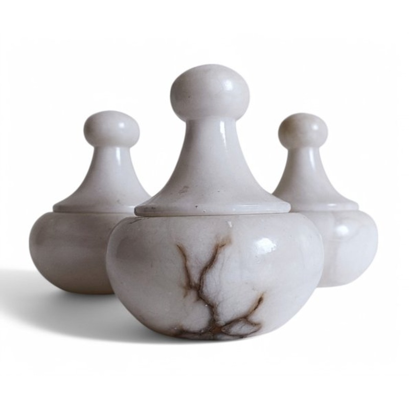 An absolutely gorgeous set of three Art Deco alabaster urns, hand-carved in Spain circa the 1930s. In pristine condition. All same size. Dimensions: D. 12cm x H. 15cm (4.72 x 5.90 inches) Heavy, solid pieces. Stunning in the hand. Ideal as a vanity table o