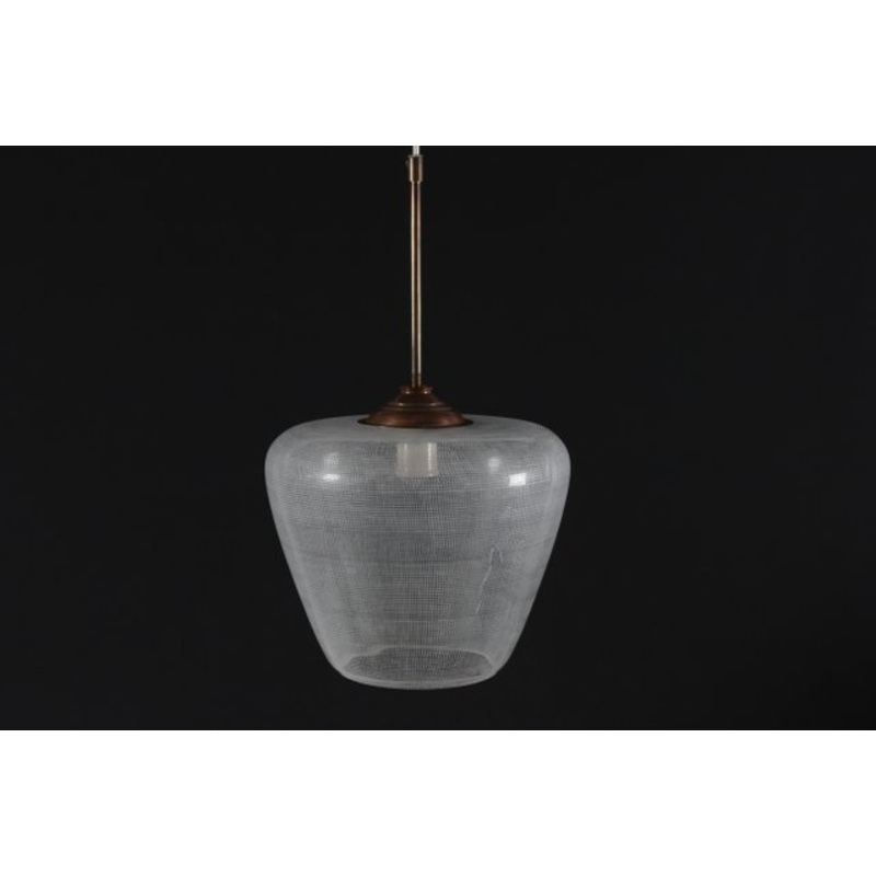 Large vintage bell shaped glass pendant made from clear glass with sandblasted stripe decor. It is mounted with a copper hat and a long brass tube for the wire.