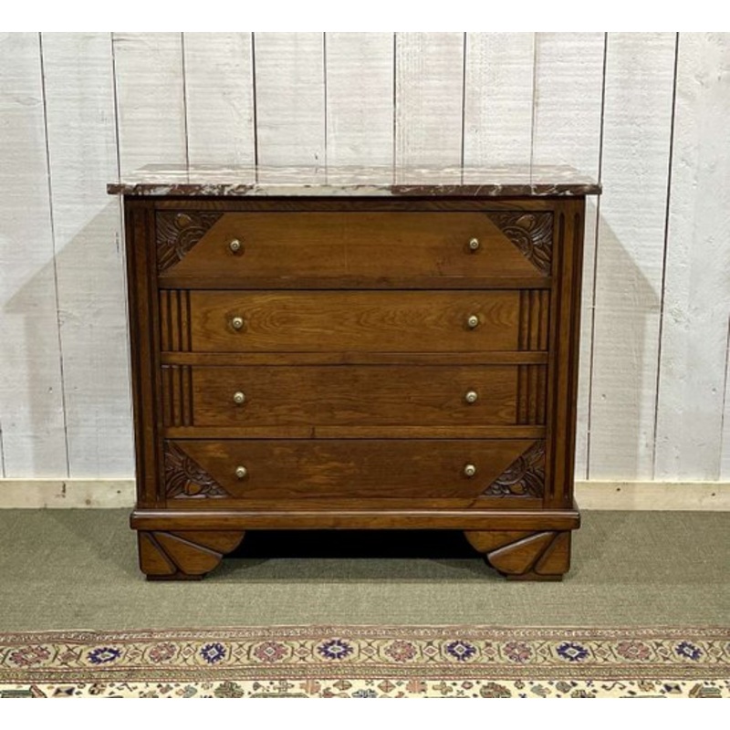 Art Deco period chest of drawers in oak and marble top – L=93cm, D=45cm, H=80cm.