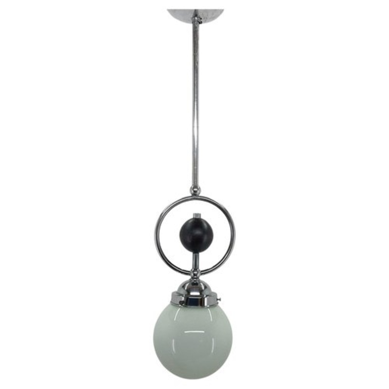 Art deco chrome and milk glass pendant light with a wooden decoration. Made in the early 1930's in Czechoslovakia. Design Period 1920 to 1949 Production Period 1930 to 1939 Country of Manufacture Czech Republic Style Vintage, Art Deco Detailed Condition Ve