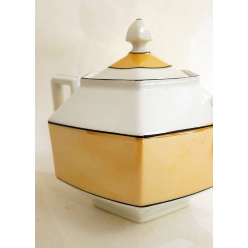 Art Deco sugar bowl in a faceted hexagonal shape, angular handles; in white porcelain, with iridescent orange cover & black edging