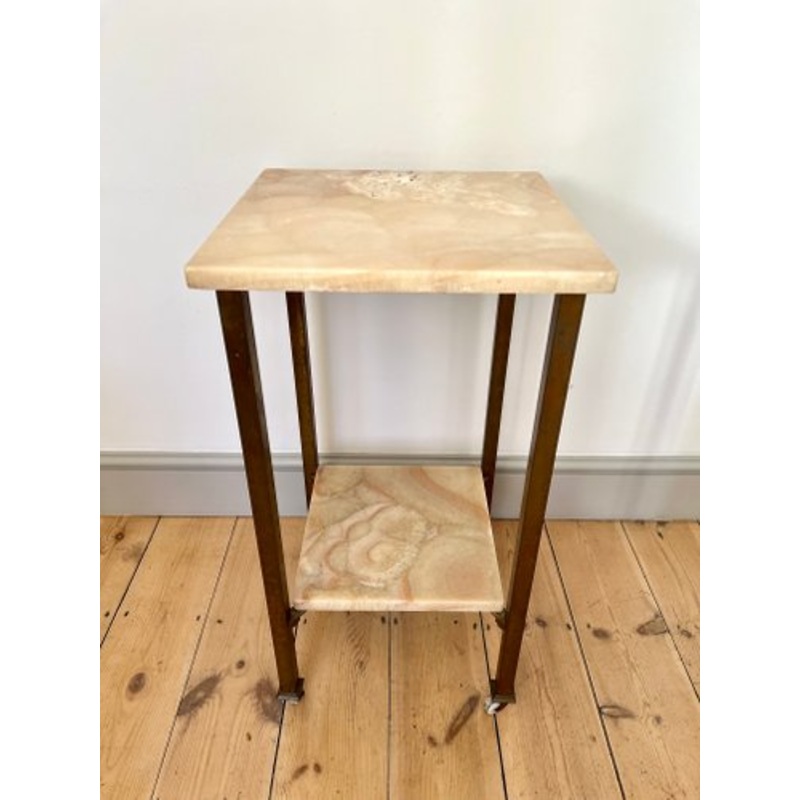 Antique French brass and marble trolley stand with shelfNeutral tone marble with peach/pink hi-lights. Brass legs with original ceramic casters.Excellent original condition. Brass has a lovely aged patina. Marble is in very good condition with no cracks, l
