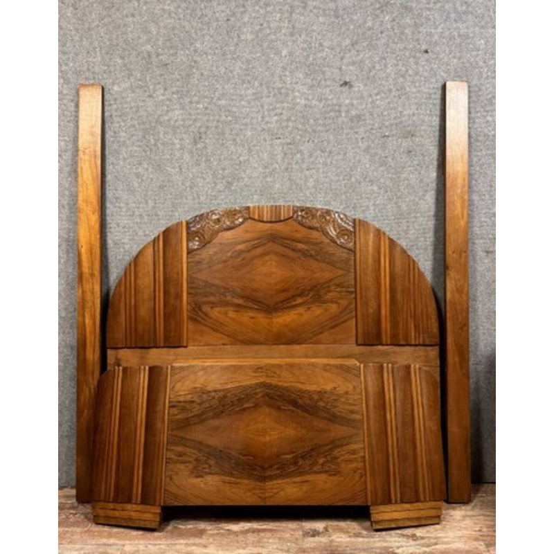 mahogany center bed art deco period circa 1925Decors in stylized flower sculptures and napkin foldsArc-shaped headhectic curved footsits on wide solesvery nice piece of furnitureH133x150x200 Design Period 1920 to 1949 Production Period 1920 to 1929 Style A