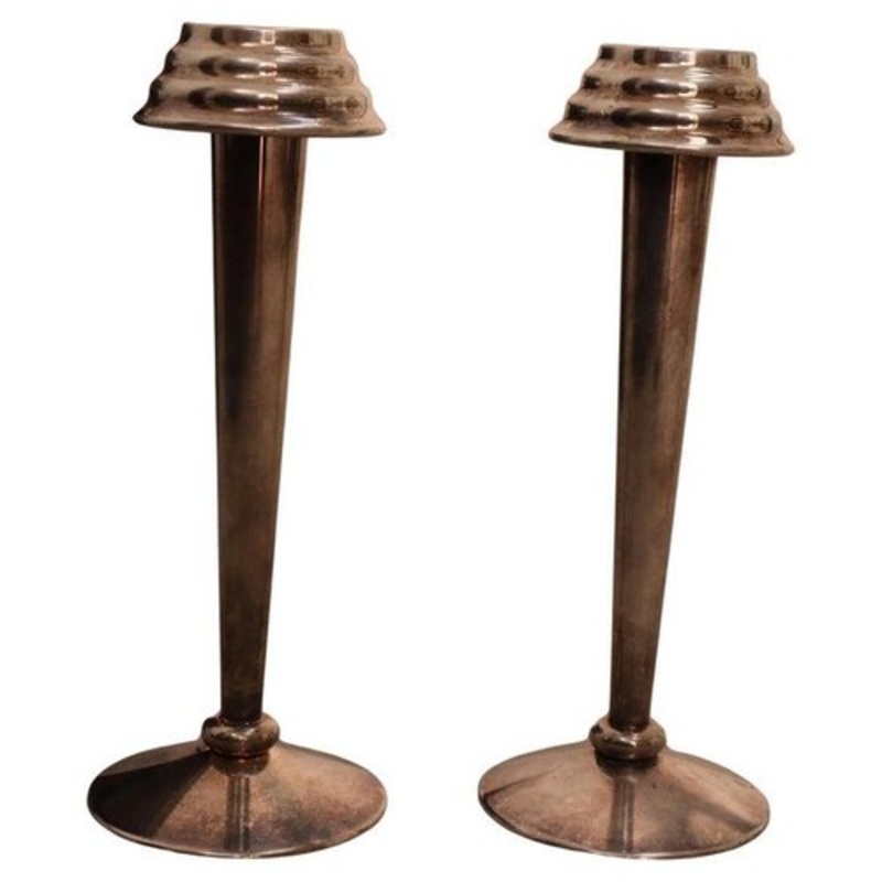 This refined pair of Art Deco candelabras, crafted from nickel-plated brass, embodies the sophisticated elegance and geometric precision typical of the 1930s. Their original patina enhances their vintage charm, making them a rare and highly collectible decorative piece. The essential and slender design is a testament to the refined Art Deco aesthetic, where form and function blend harmoniously. The cylindrical base ensures stability, while the tapered body rises gracefully to support a single candle, creating a warm and enveloping atmosphere. Perfect for classic, modern or eclectic interiors, these candelabras can be used as centerpieces, fireplace decorations or accents to enhance any space. Whether displayed individually or as part of a curated collection, they are sure to attract attention and admiration. Dimensions: Height: 24 cm Diameter: 10 cm A unique and rare piece, ideal for collectors, Art Deco enthusiasts and lovers of timeless design.
