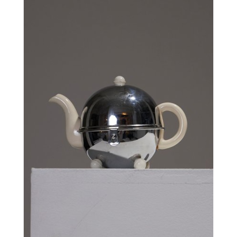 White porcelain ball teapot covered in chrome metal, in the Art Deco style of the 1930s. The elegance of porcelain combines with the solidity of stainless steel, with geometric lines and refined finishes. Porcelain guarantees optimal heat diffusion, while stainless steel reinforces its durability.