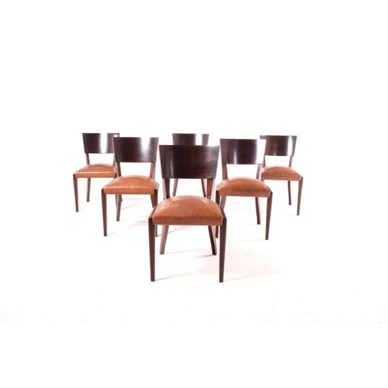 A set of French Art Deco period dining chairs. Chair backs are walnut veneer and frames are walnut. Seats are upholstered in nappa, very soft and durable.