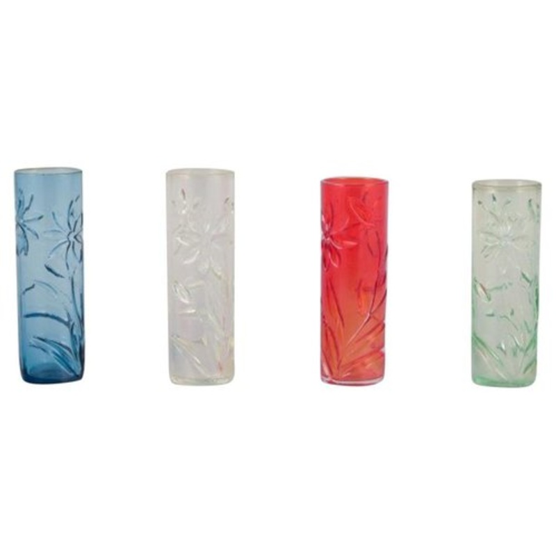 Fglavik, Sweden. A set of four art glass vases with flower motifs. Handmade and in various colors. 1970s. Perfect condition. Dimensions: H 16.5 + 17.5 cm x D 5.0 cm. Design Period 1970 to 1979 Production Period 1970 to 1979 Country of Manufacture Sweden St