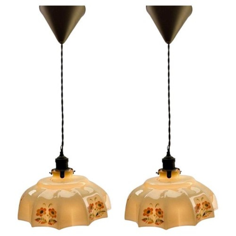 Art Nouveau ceiling lamp. Photography fails to capture the simple elegant illumination provided by this lamp. Fitting messing pendant ceiling light with fixing to hold a stylish Belgian Art Deco lampshade. Good distribution of darker and lighter bleu shades. A perfect example of Art Nouveau decorative arts, an original piece, made in the period 1930. Measures: Shade 24 cm x 12 cm. On an adjustable wiring. We are happy to adjust the height to your wishes at no extra cost. In excellent condition and in full working order. New Wiring originel fitting E27 And safe for immediate usage in the world.