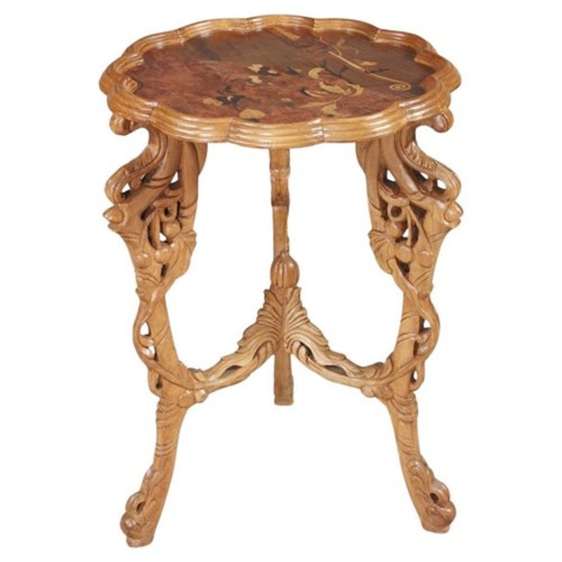 20th century side table E. Gall, Art Nouveau Solid wood with floral carvings. Variously colored marquetry on solid wood. Heraldic inlaid and profiled framed tabletop. Table top on multiply articulated openwork frame. A timeless piece. Hand-polished shellac