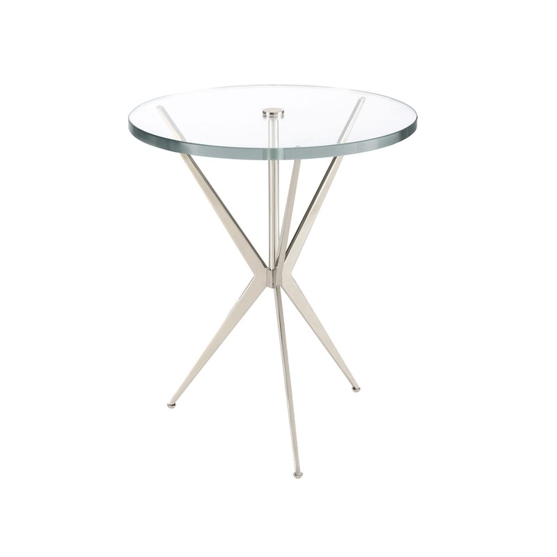 A circular glass table with Nickel base.Dimensions H 50cm x Diameter 50cm