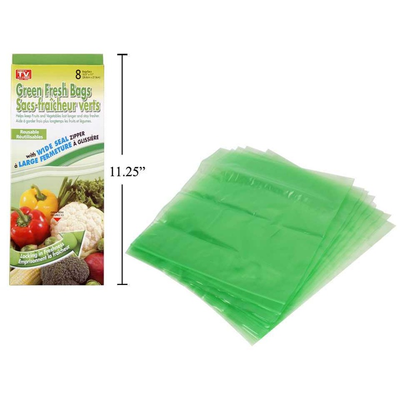 FEATURES:Includes 8 bags, 10.5 x 11"These bags absorb and remove the ethylene gases to keep fruits and vegetables lasting longer. Even works on Flowers and Herbs!Wide-Seal zipperReusableLocks in freshness