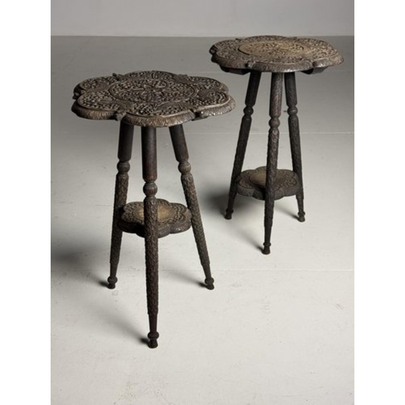 Set of 2 richly decorated side tables. Presumably from South East Asia, early/mid 20th century. Very heavy, solid and sturdy. Both in good condition. Dimensions: 40w x 39d x 60h Production Period Before 2010 Style Vintage, Empire Detailed Condition Good Th