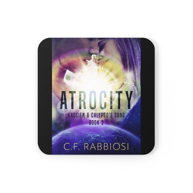These coasters are made with a high-gloss top and feature a cork back to prevent sliding, and each order comes with a set of four coasters. The cover art in these coasters is from C.F. Rabbiosi’s book, Atrocity.