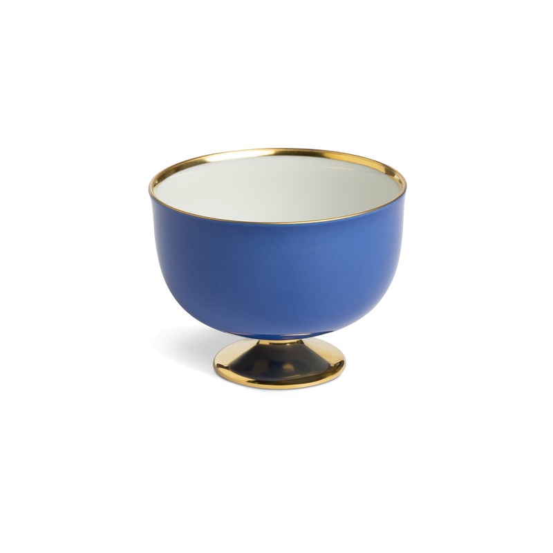 Porcelain footed bowl with 24k gold rim and 24k gold base.DetailsPerfect for dessert or even wine or champagne or as a table accessory. Features a colored glazed exterior and adorned with a gold foot and rim. Made of porcelain.Handcrafted in Vienna, Austri