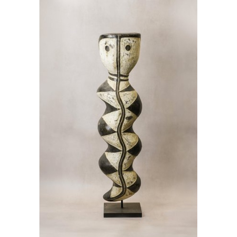 This is a Baga protective serpent, known in the literature under various names: Bansonyi, A-mantsho-na-tshol or Inap. The serpent represented is said to be similar to the ferocious python which spirit called Ninkinanka is involved in curing infertility and droughts, bringing prosperity, wealth, and rain. These sculptures are worn on the top of the head, with a headdress to hold it fitting around the shoulders. They make beautiful interior design objects. Size: 118cm H x 30cm Width Base Depth: 25cm