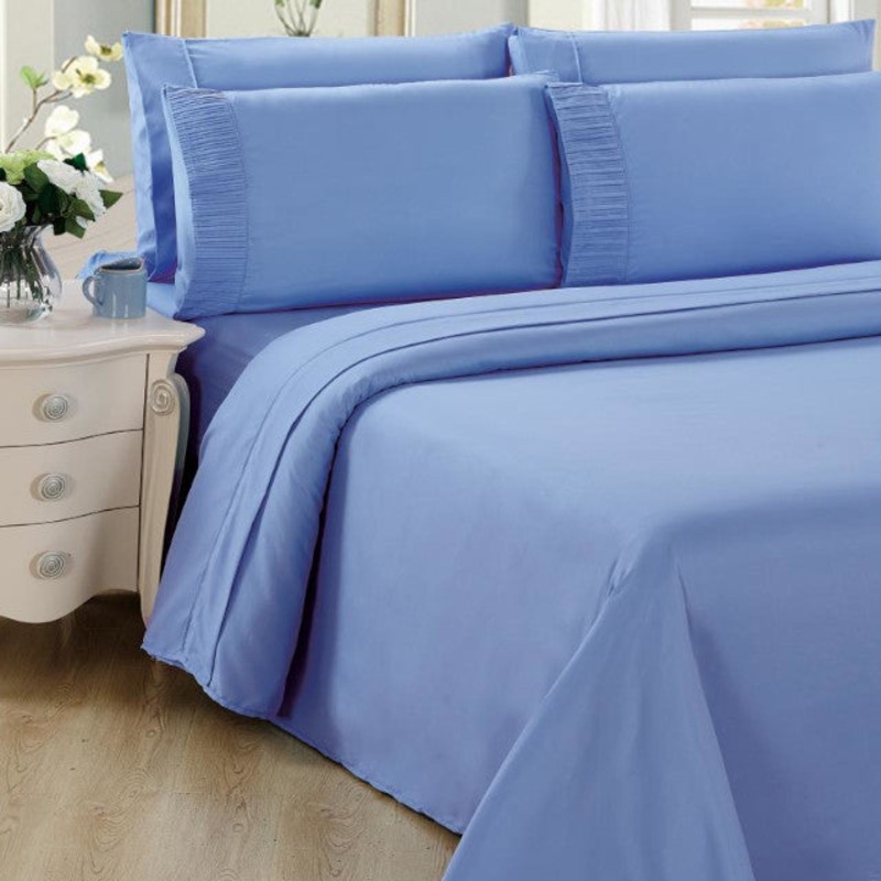 6 piece sheet set includes: 1 flat sheet, 1 fitted sheet and 4 pillow cases85% Polyester and 15% Rayon from BambooDeep Pocket up to 17 inchesKing sizePleated Bamboo sheetsWrinkle FreeLight blue