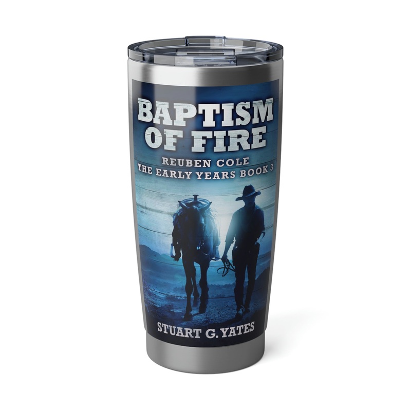 Minimize your plastic footprint with style. This tumbler fits perfectly into car cup holders, and the rubber gasket makes it spill-resistant on bumpier roads. The double-wall insulation makes sure drinks stay at the right temperature until the next pit stop. The cover art in this 20 oz tumbler is from Stuart G. Yates’s book, Baptism Of Fire.
