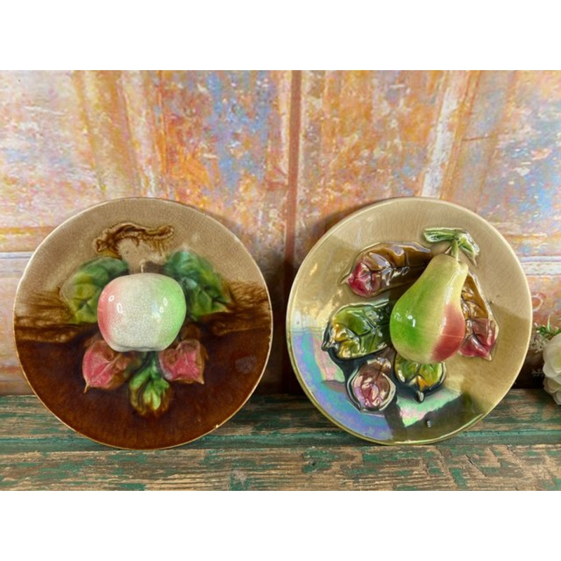 Superb pair of French slip plates dating from the end of the 19th century, highlighting relief patterns of fruit in vibrant colors. One of the plates is decorated with an apple, the other with a pear, both surrounded by finely detailed leaves.One of the pl