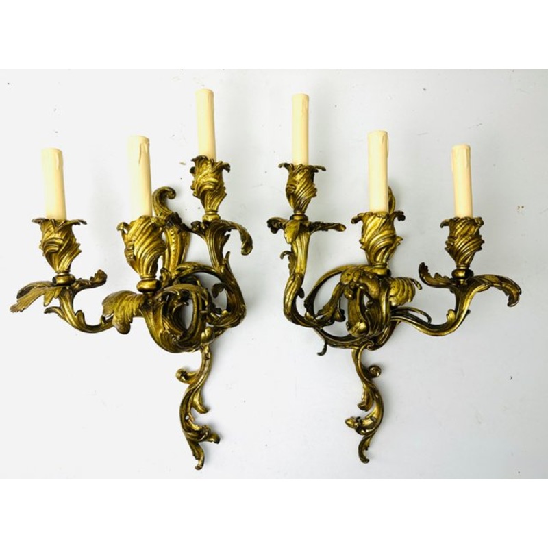 3-armed wall appliqus in brass in the shape of acanthus leaves. The wall lights are not mirror-like. Design Period Before 1890 Production Period 1980 to 1989 Style Baroque Detailed Condition Very Good This vintage/antique item has no defects, but it may sh