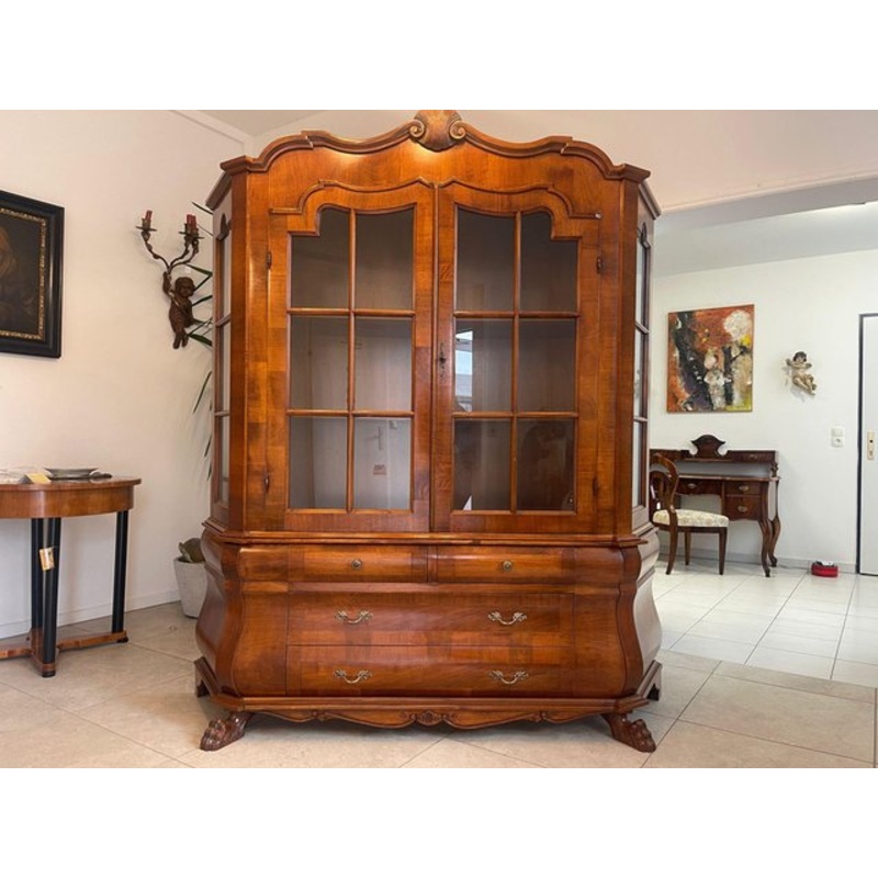 Baroque top sideboard glass display case bookcase dimensions: height x width x depth 210 x 180 x 45 For sale is a magnificent glass display case in the baroque style. This magnificent baroque style top display cabinet or bookcase is a masterpiece of timeless elegance and craftsmanship. This display cabinet is equipped with ornate metal-decorated fittings/handles, which are not only practical but also an aesthetic highlight. A beautiful top wood veneer is presented on the front and sides of the display case in a harmonious field marking. This gives the bookcase a warm and elegant look. The finely curved glass windows complete the appearance and make this showcase an unmistakable eye-catcher. This display cabinet was made around 1970, so this piece of furniture skilfully combines a historical look with modern manufacturing. It is not only a functional piece of furniture but also a statement of style and class. It is designed in 2 parts which makes it very easy to transport to higher floors. This is a real dream piece that will enrich your living space with its extraordinary beauty – an investment in timeless elegance.