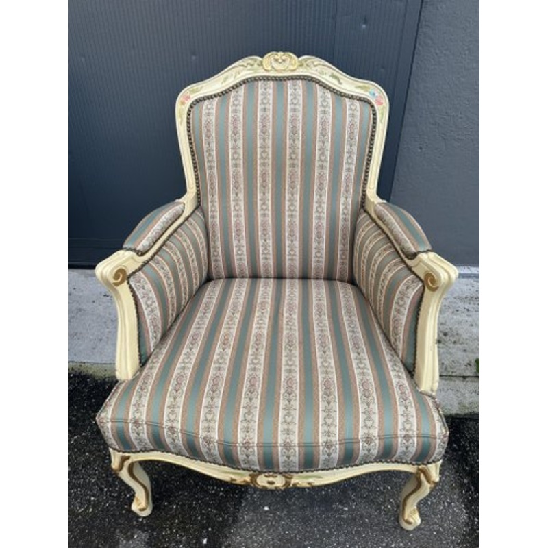 3-piece living room: two-seater sofa and two bergre armchairs, in Venetian baroque style dating back to the mid-20th century. In cream lacquered wood, with gold finishes and floral designs; seat and back in vertical striped fabric with flowered pattern. In excellent general condition, healthy and solid structure, perfect upholstery.